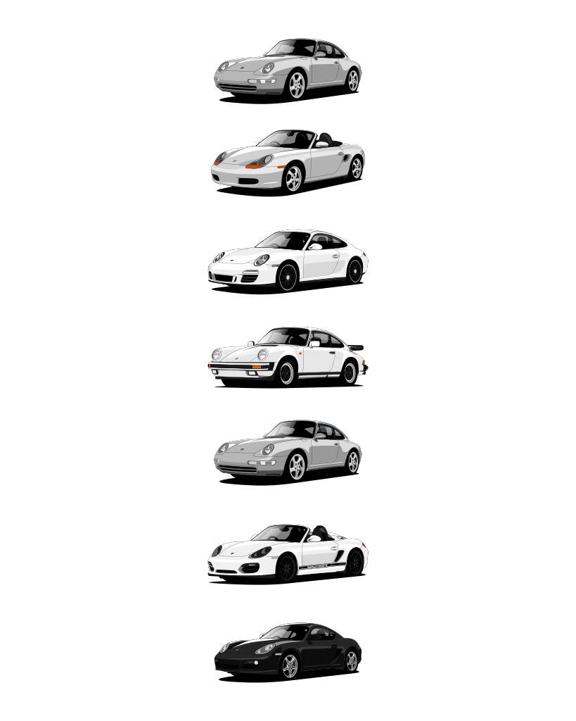 We draw all cars in our modern stylised graphic way. In order to find a balance between quality and price we don’t draw all details, text & logos. The base price includes all standard road cars details.